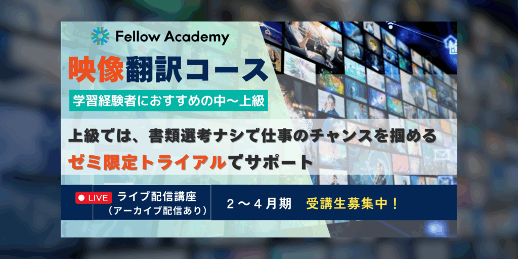【映像翻訳スクール紹介】学習経験者におすすめのライブ配信講座:2026年2~4月期映像翻訳コース<中~上級>申込受付中!(フェロー・アカデミー)